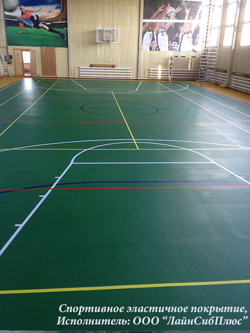 Спортзал "ГУФСИН" - спортивное эластичное покрытие, менее травмоопасное, толщина покрытия 12мм, г. Иркутск Также выполнены работы по разметке пола: четыре разметки - мини футбол,баскетбол,большой теннис, волейбол